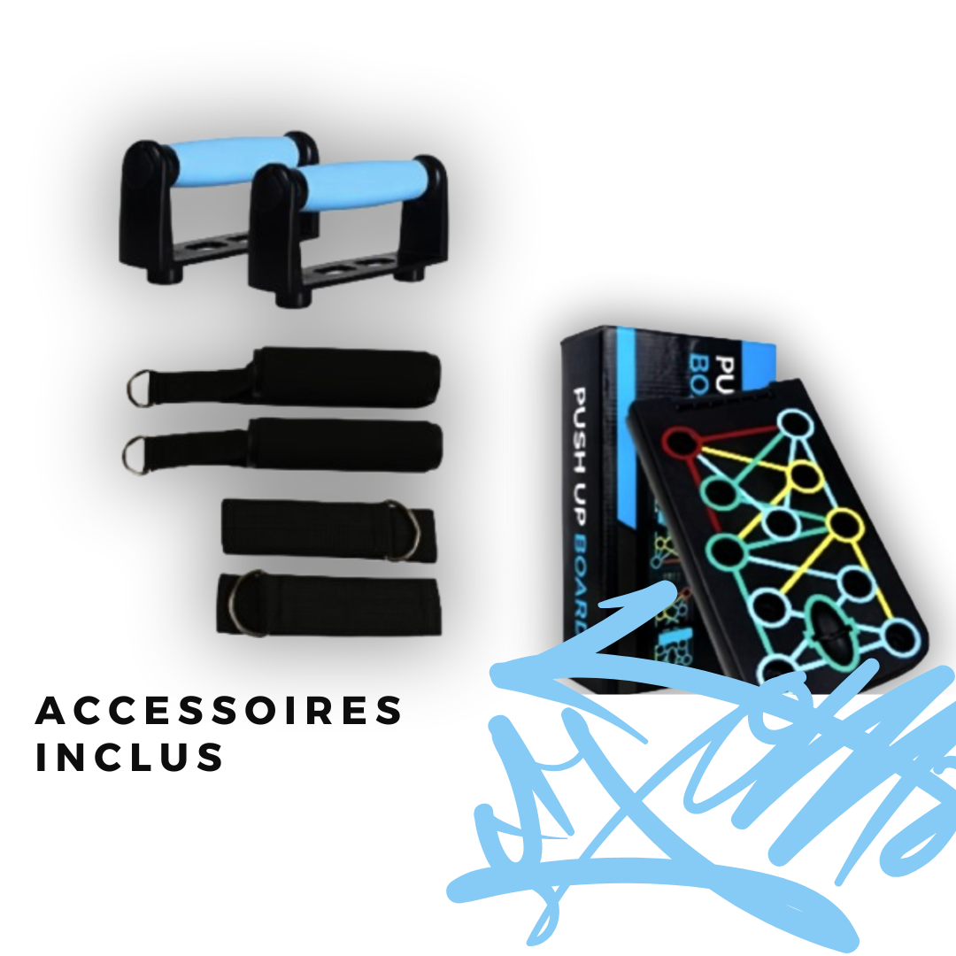 Améliorez votre force et votre posture avec cette planche à pompes multifonction équipée de bandes de résistance. Facile à utiliser, elle permet de cibler différents groupes musculaires (poitrine, épaules, dos, triceps). Les bandes de résistance ajoutent une intensité supplémentaire à vos exercices pour un entraînement plus efficace. Compacte, antidérapante et adaptée à tous les niveaux, elle est idéale pour vos séances à la maison ou en déplacement.